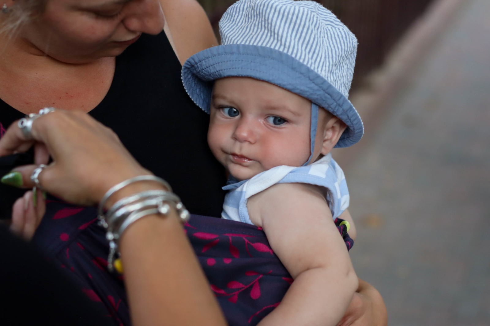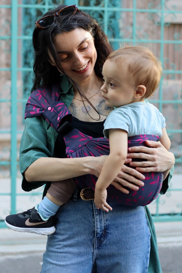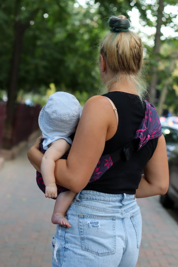 Pentru tine, va fi cel mai rapid mod de a pune copilul pe șold. Îl poți aranja astfel încât să stea cu mâinile afară, la orice vârstă, dar și cu ele înăuntru.