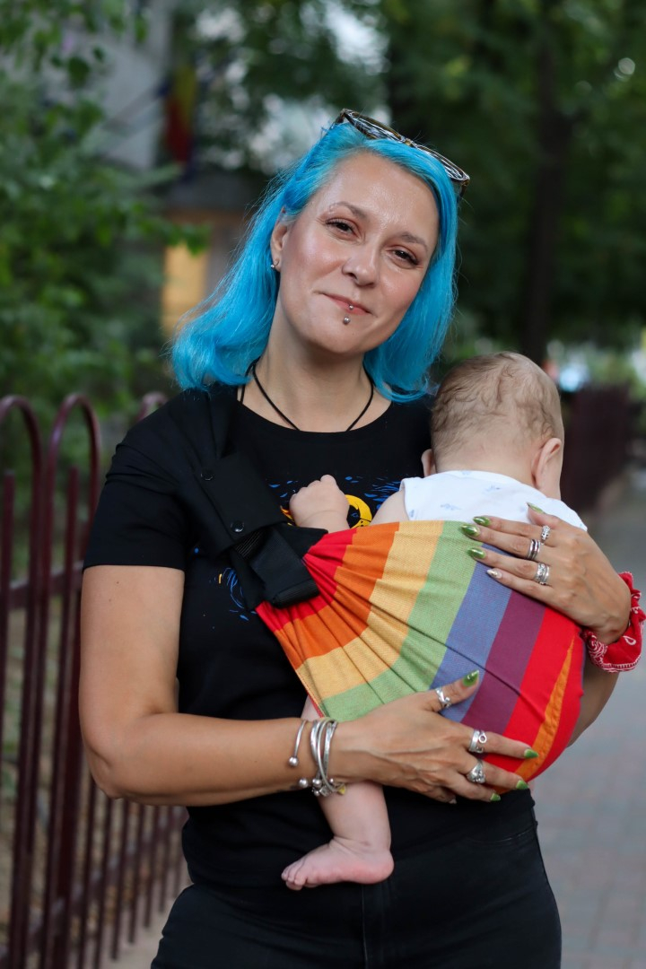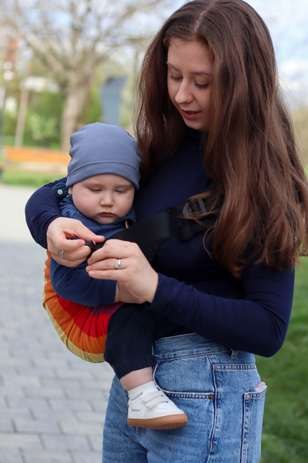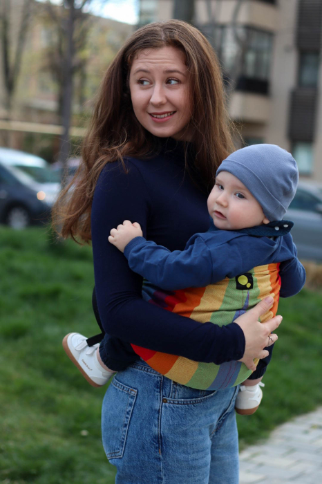 ROA, sling hibrid, cu loc preformat pentru copil și închidere cu catarame, foarte ușor de pus și de scos.